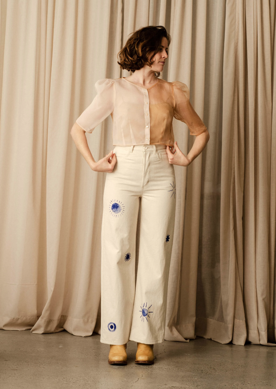 This is an independent clothing label by the designer Kate Megaw, all garments are locally made 30km from the penny sage studios. And all suppliers for Penny Sage are family run New Zealand Based companies